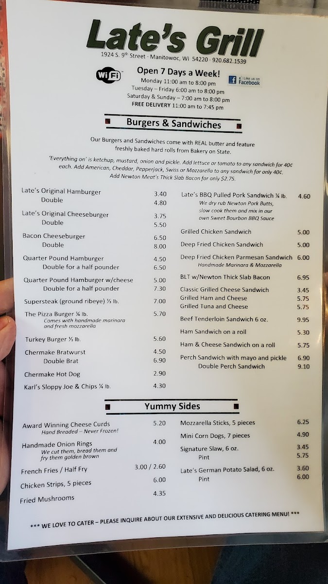 “ Stopped in for a quick bite while in Manitowoc. I have been here before, but it was 5 or so years ago. Great menu and many options. The server was very helpful and there were quite a few people that had come in for carry out. Service was fast and food was good. I tried the pork sandwich, fish sandwich and their made from scratch onion rings. All three were delicious and filling. I would highly recommend Late’s to those seeking casual fare. ”